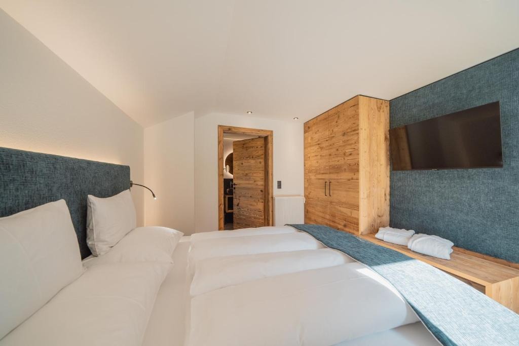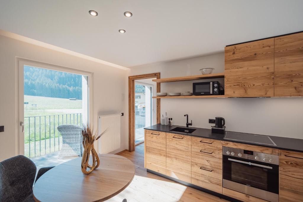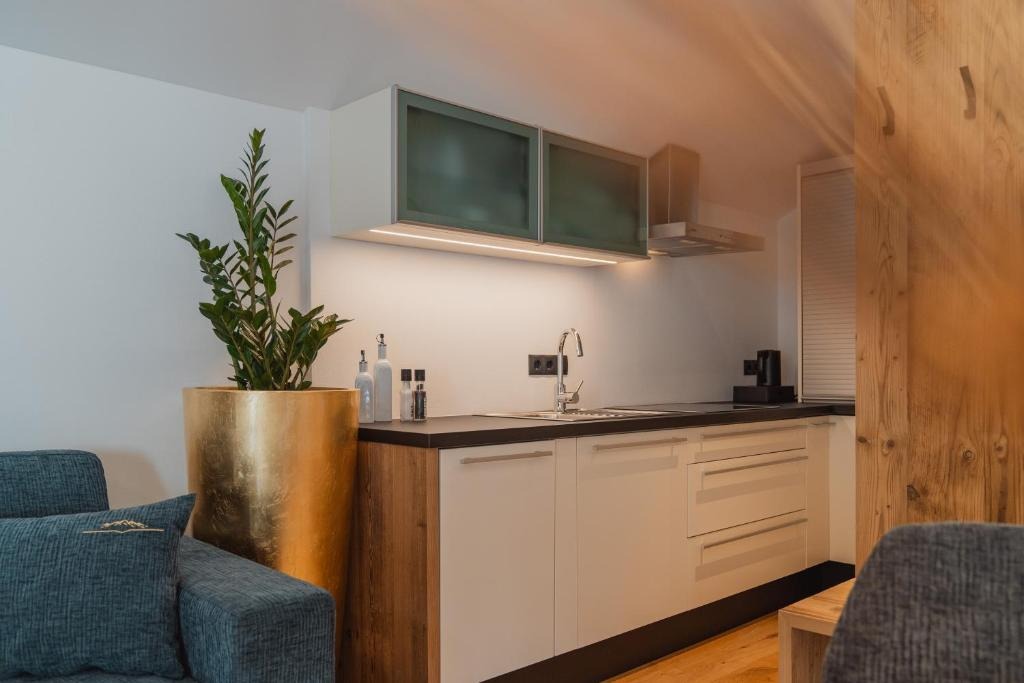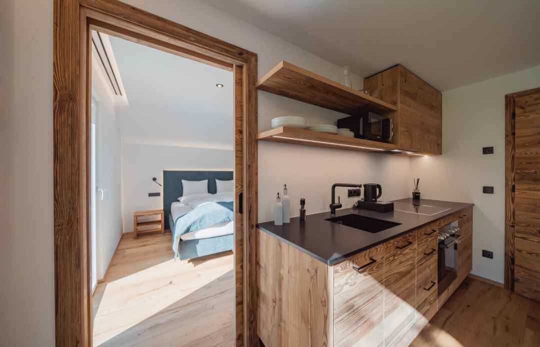 Die hochwertig ausgestatteten Apartments überzeugen durch klare Linien, helle Räume und natürliche Materialien. Großzügige Wohnbereiche, voll ausgestattete Küchen und private Balkone oder Terrassen schaffen viel Freiraum und Unabhängigkeit. Die stilvolle Einrichtung sorgt für eine warme Atmosphäre, in der man sich sofort zuhause fühlt – ideal für Paare, Familien oder Ruhesuchende.