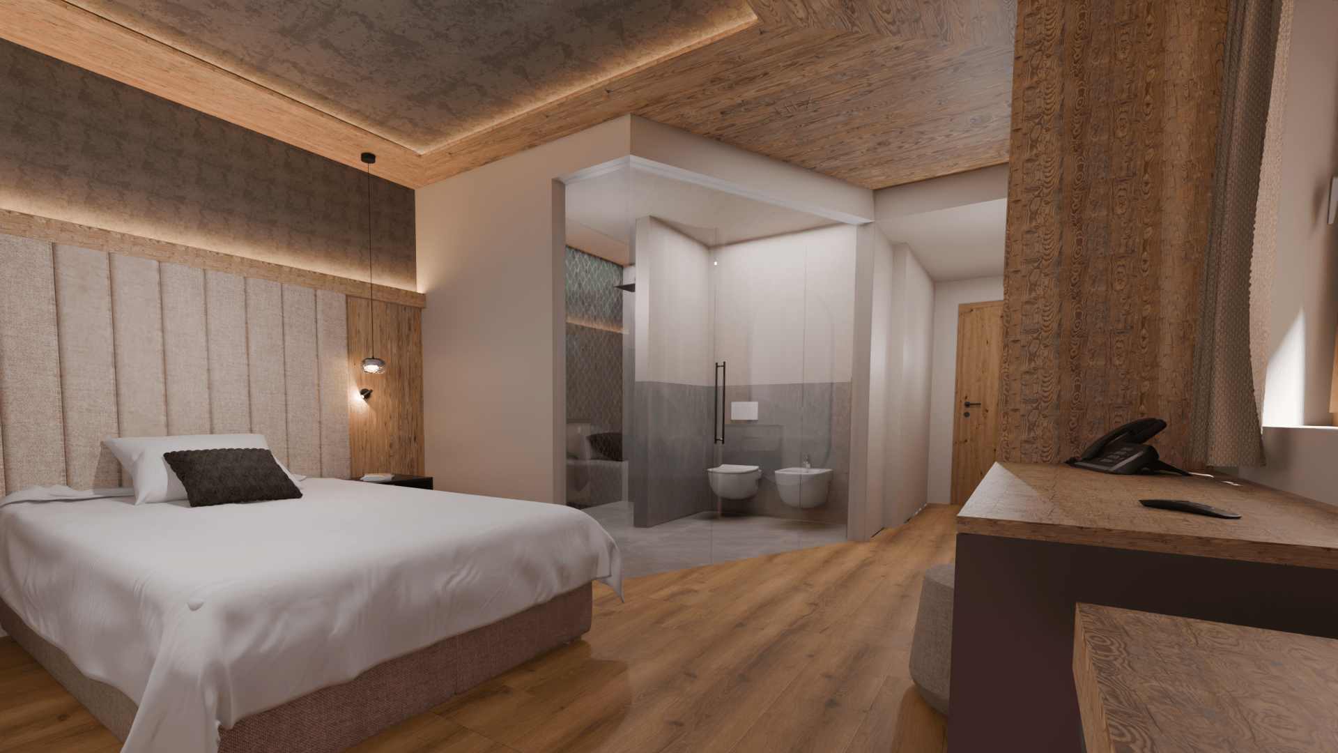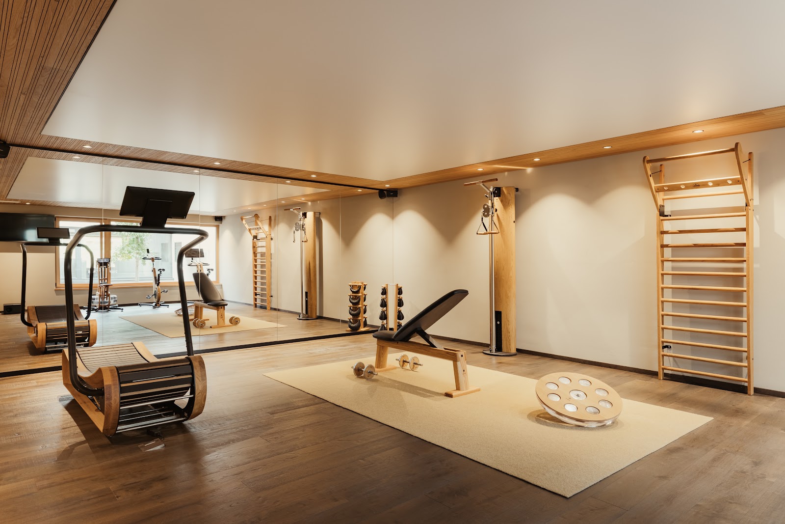 Der modern ausgestattete Fitnessraum überzeugt mit hochwertigen Holzdesign-Geräten und motiviert zu aktiven Momenten – funktional und ästhetisch zugleich.